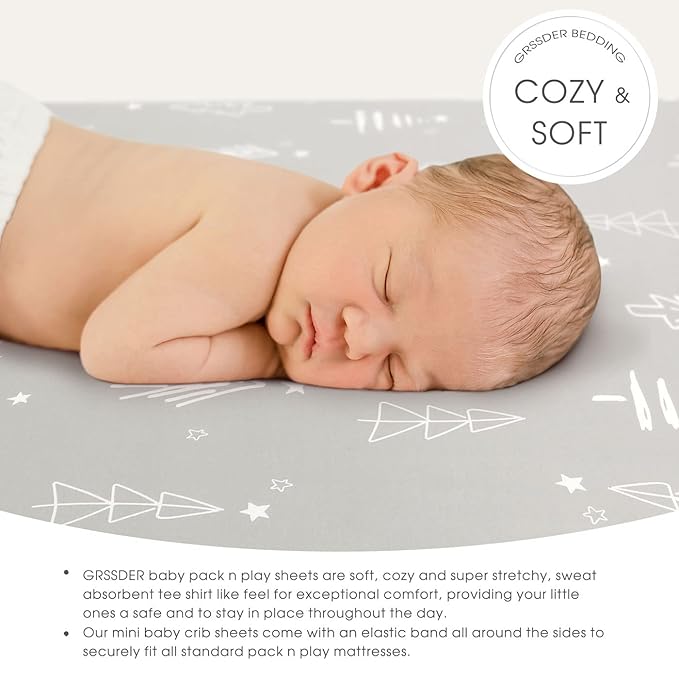 - Ultra Soft & 4-way Stretch: Made of 100% high quality soft stretchy jersey knit fabric. GRSSDER mini crib sheets offer a breathable, sweat-absorbent tee shirt like feel for exceptional comfort, providing your little ones a safe and to stay in place throughout the day.