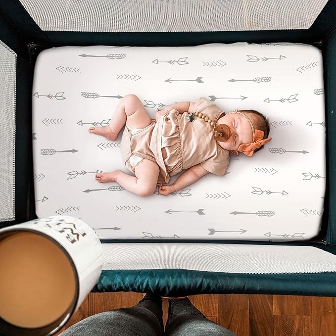 - Apple It Within Seconds: Thanks to the elastic bottom, our pack and play sheets come in a classic, the simple arrows and Christmas trees printed design that will put the finishing touches to any bedding. Make sure to give your darling a serene and calm bed to rest in.