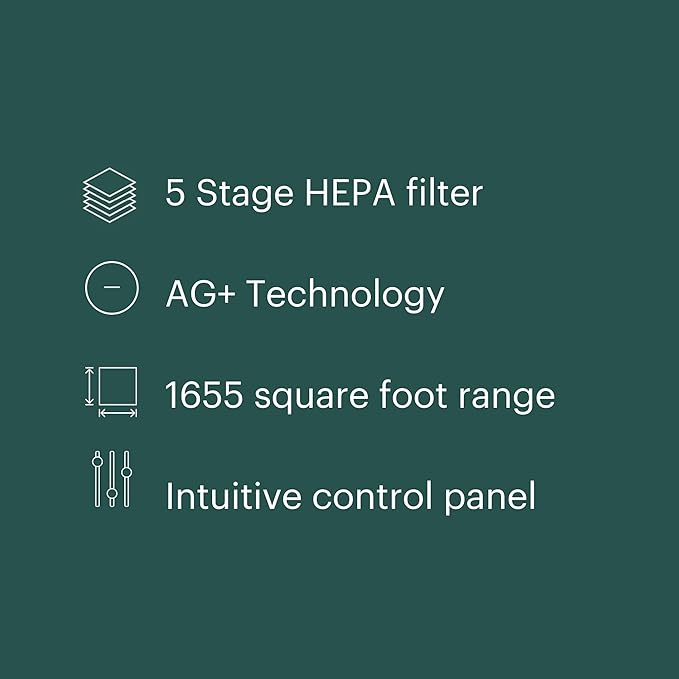 - Comprehensive 5-Stage Filtration System β Equipped with a pre-filter, H13 HEPA filter, activated carbon filter, UV technology, and plasma purification, this air purifier effectively captures airborne particles as small as 0.3 microns, including dust, pollen, smoke, and pet dander, ensuring cleaner air in your home across 1,655 square feet
