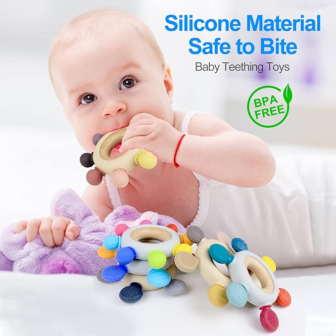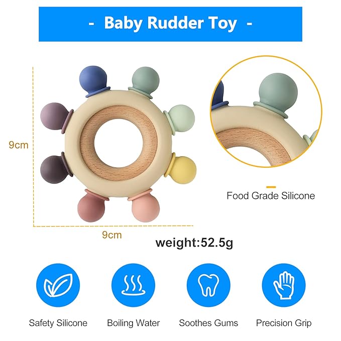 - ★ SAFE MATERIAL – 100% food grade silicone and natural beech. The size of this silicone rudder teether is designed to be just the right size to prevent babies from swallowing.