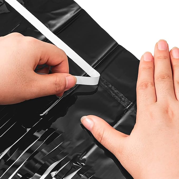 - The top of foil fringe curtains are covered with 1.2cm wide double-sided adhesive tape, eliminating the need for push pins or tacks that could damage walls. Perfectly stay in place for the duration of indoor or outdoor party celebration.