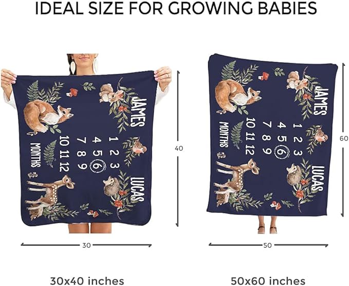 MDPrints Personalized Twin Milestone Blanket, Custom Monthly Baby Blankets with Name for Boys and Girls, 30x40 & 50x60inch Soft Plush Fleece (Dark Blue)