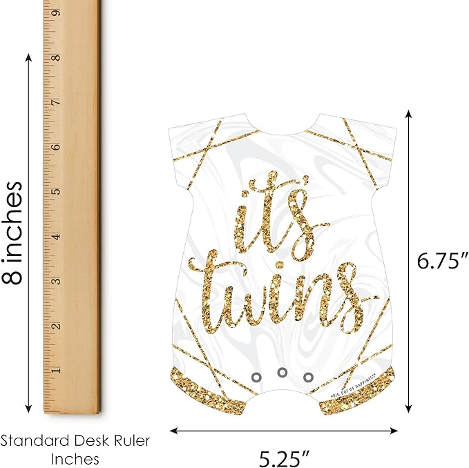 - HIGH-QUALITY: It’s Twins Shaped Bingo Cards and Markers are professionally printed and double-sided on sturdy cardstock paper. They are individually inspected and carefully packaged by hand. Each baby bodysuit-shaped card measures 5.25” Wide x 6.75” Tall, perforated marker sheets measure 2.75” Wide x 5” Tall and individual markers measure 0.75” Wide x 0.75” Tall.