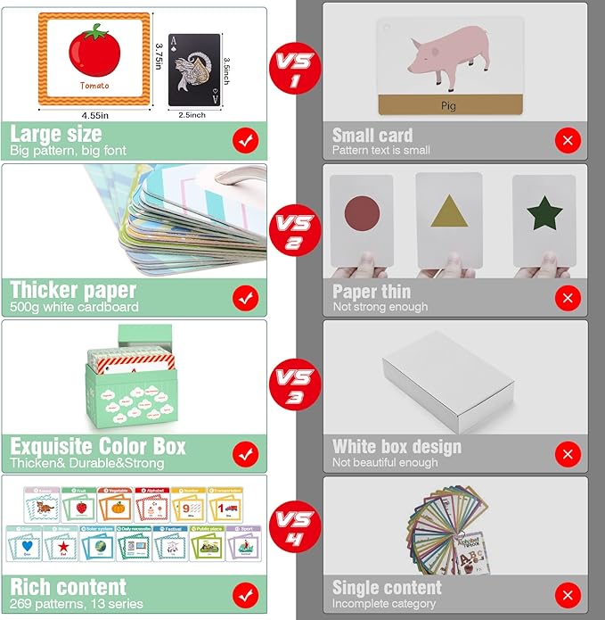 - 1)500g thicken paper. Waterproof surface durable、tear resistant. 4.55x3.75 inch perfect toddlers hand size. 5.1x4.2x3.4 inch beautiful exquisite gift box. Including 105pcs cards, 269 pictures. 4pcs metal sorting rings. Animals Number ABC Alphabet Fruits Vegetables Shapes Transportation Preschool Kindergarten ABC Alphabet toddler flash cards for Toddlers 2-4 years ages.