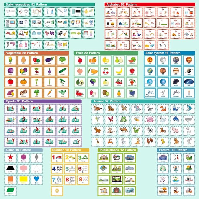 - 3)Cute delicate carton design. High quality printing for each color to bright full and clean. Different series with different color classification to identify. Animal:( 16pcs, 32pictures), Fruits (10pcs, 20 Pictures), Vegetables (10pcs, 20Pictures) Color&Shape: (5pcs, 10pictures) . Number&Transportation: (5pcs. 10 pictures). Sports:(31 pictures), Alphabet:(52 pictures), Public Places(14pictures), Festival(12pictures), solar system(16pictures), Daily necessities(52pictures)