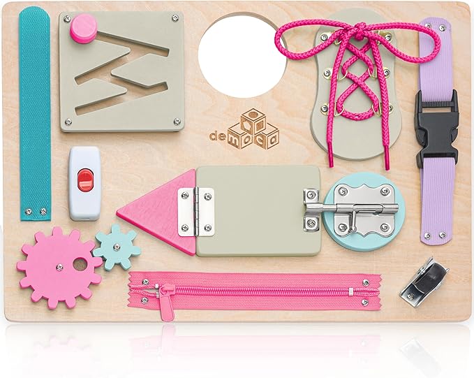 - Activity Board for Toddlers - This montessori busy board for 1 year old offers a fun and educational way for kids to develop fine motor skills and independence. Featuring interactive elements like a zipper, velcro, gears, switch, labyrinth maze, latch, shoelace, and buckle, this hands-on busy board helps toddlers practice essential daily tasks.