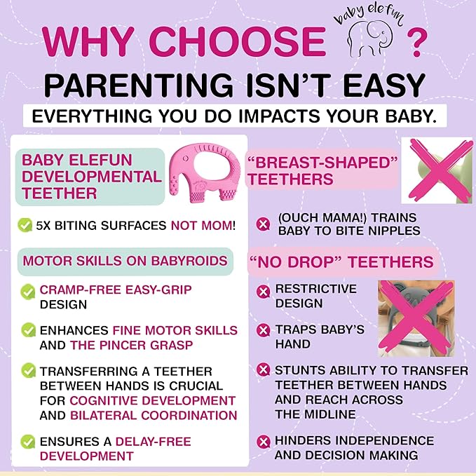 - Your hands free, without the harm - do what’s popular? Or what’s right? Don’t delay your baby - while no drop teething toys and mittens could cause significant delays by blocking babies hand from grasping, dropping and passing objects back and forth - a critical motor skill - Baby Elefun teether is the easiest to hold Pediatric Dentist Approved teething ring without stunting critical sensory development. Thanks mom and dad!
