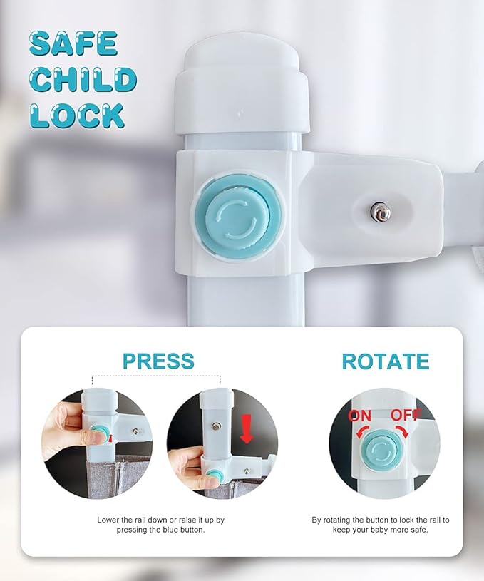 - 【Freely Get in And Out of Bed for Parents】- The toddler bed rail designed with double side child safety lock to prevent baby's accidental operation, lift each side Independently, with one hand to push the lock button, smoothly with no stuck, more convenient for parents to get in and out of bed freely.