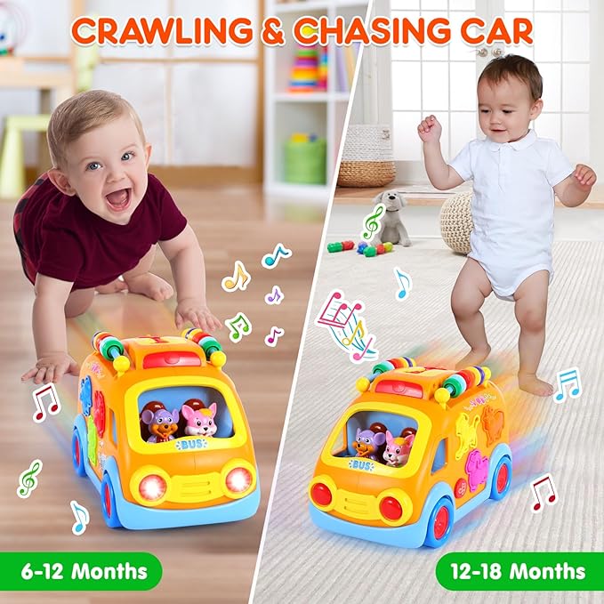 - SEVERAL WAYS TO PLAY WITH: Novel toys for 1 year old boy girl with 6 animal blocks, 9 pieces of music, 12 colorful beads, it can unlock, match blocks, rotate gears, autopilot. Cheerful melodies, flashing lights, dancing drivers will attract your baby's attention. Multi-functional cartoon music bus, bring endless fun, are bound to keep your baby occupied, happy and calm!
