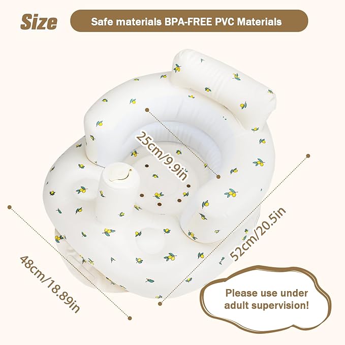 - Safe and Stable: The portable baby seat is made of thick BPA-free PVC, non-toxic and skin-friendly, air holes in the seat to keep the air flowing, a comfortable tall-up back to prevent the baby from falling, and the baby seat is designed with cute patterns and a stylish appearance, perfect photo props, the baby will love to play in the baby sit up chair