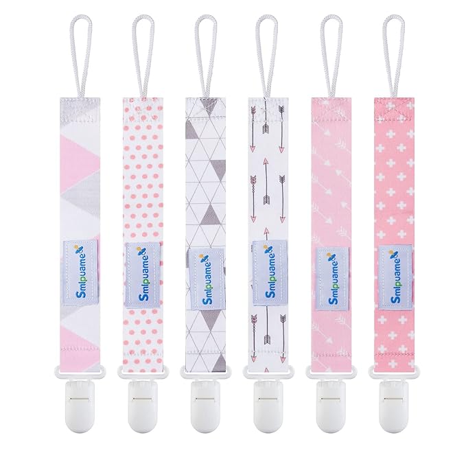 - Amazing Value For Money:Smlpuame baby pacifier clips kit Includes 6 pack different stylish pattern pacifier clips–These girl pacifier clips will look great on baby girls with its trendy pattern,and can match all kinds of baby clothes.The colorful pattern can promote your baby visual perception,sensory development. Our baby pacifier holder with universal loop fit most of the pacifiers and a variety of teething soothers,keep your pacifiers from getting lost and out of dust and germs