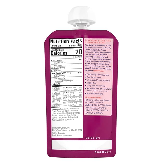 - ORGANIC BABY & TODDLER FOOD POUCHES - Our Beet Carrot Blueberry baby food pouches were created by a devoted mother who is also a neurosurgeon and a doctor in developmental neurobiology. After years of trial and error, she developed the perfect baby squeeze pouches made with whole, organic ingredients and backed by scientific nutritional studies. Cerebelly's toddler and baby food puree pouches are the best meal or snack for your child’s growing brain.
