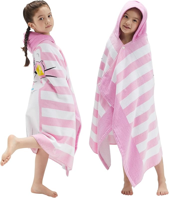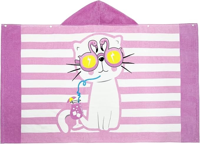 BANGSAUR Kids Hooded Beach Bath Towels, 100% Cotton 50x30 inches Wrap Towel, Toddlers Girls 3-12 Years Coverup Pink Cat