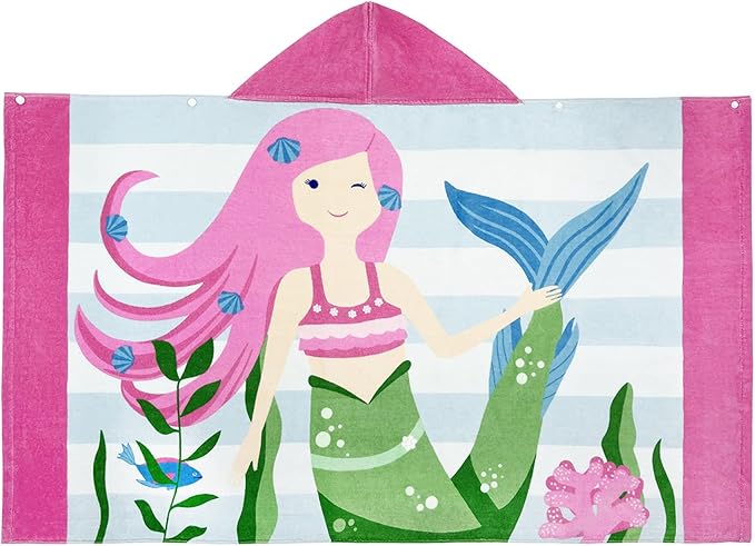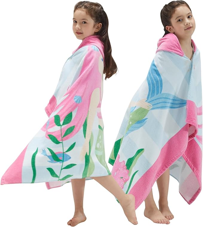 BANGSAUR Kids Hooded Beach Bath Towels, 100% Cotton 50x30 inches Towel Wrap, Toddlers Girls 3-12 Years Coverup Pink Hair Mermaid