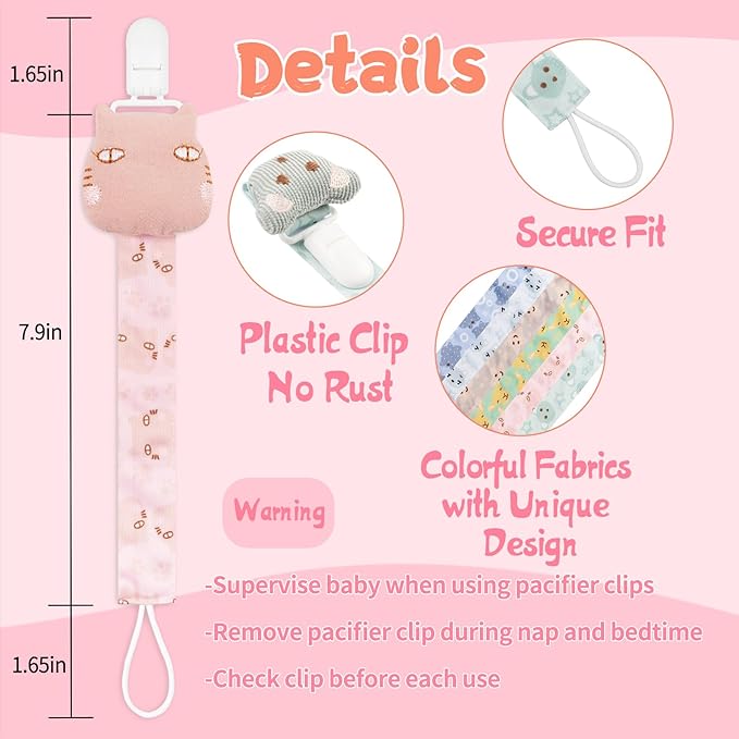 - Multifunctional Usage: These pacifier leashes are usually used for soothies, teethers,burp cloths, teething rings and toys, baby blankets, drool bibs. It is an universal pacifier clip and fits to your favorite brand of pacifier and soother.