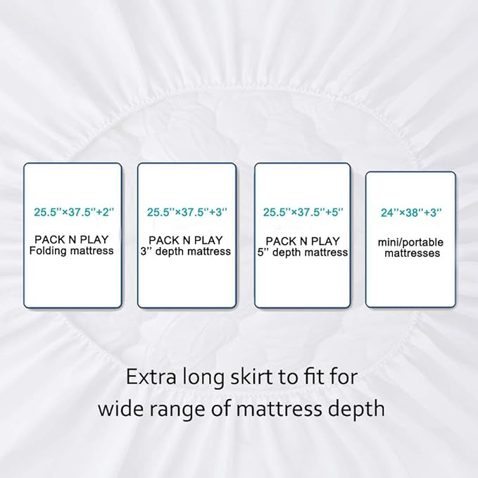 - Playard Mattress Protector(27 in x 39 in): Fitted Sheet Style up to 5'' deep fitted stretch skirt made of elasticized fabric that will securely compatible with graco pack n play playard, dream on me mattress (3" to 5") or all other mini and portable crib mattress 38" x 24".