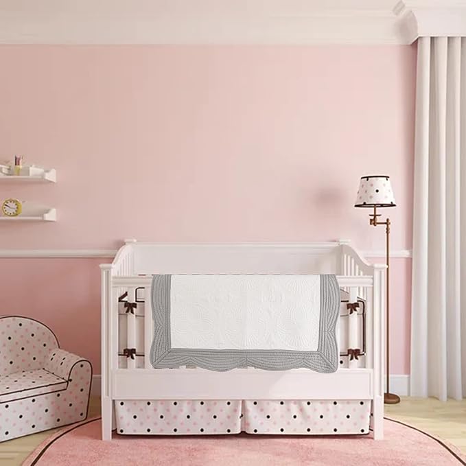 MONOBLANKS Baby Quilt Personlized Monogram Lightweight Embossed Scalloped Throw Blanket Four Seasons (White-Grey Trim)