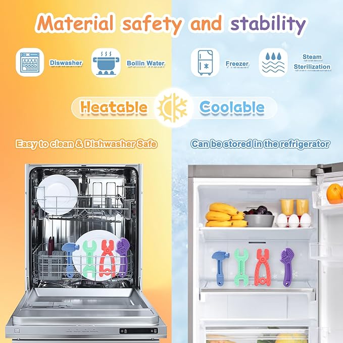 - BABY FRIENDLY DESIGN - Teething toys come in 4 different shapes: hammer, pliers, wrench, adjustable wrench, and are the perfect size for babies to grasp. Bright colors are easier to attract baby's attention. Soft and elastic, suitable for babies to chew