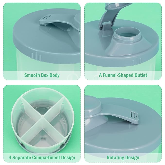 - Funnel-shaped outlet - The revolving milk powder packaging box is flat and cylindrical, rotating cap prevents powder spilling into other compartment shells. It is suitable for feeding bottles of various calibers, easy to dump.