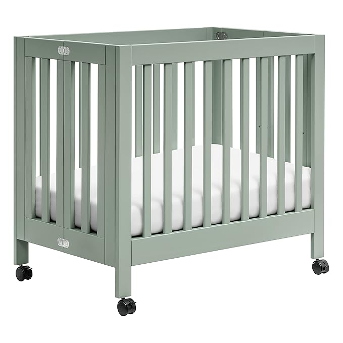 Babyletto Origami Mini Portable Crib Folding with Wheels in Light Sage, 2 Adjustable Mattress Positions, Greenguard Gold Certified