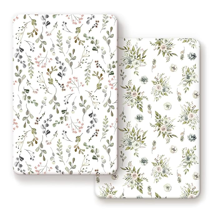 GRSSDER Stretchy Ultra Soft Jersey Knit Fitted Pack n Play Sheets Set 2 Pack, Portable Pack and Play/Mini Cribs Sheets for Girls,Stylish Watercolor Rose and Flora