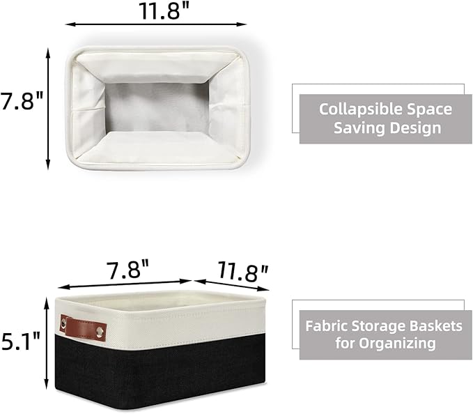 HNZIGE Small Storage Baskets (6 Pack) - Fabric Bins with Leather Handles, Foldable for Organizing (Black&White, 11.8" x 7.8" x 5.1")