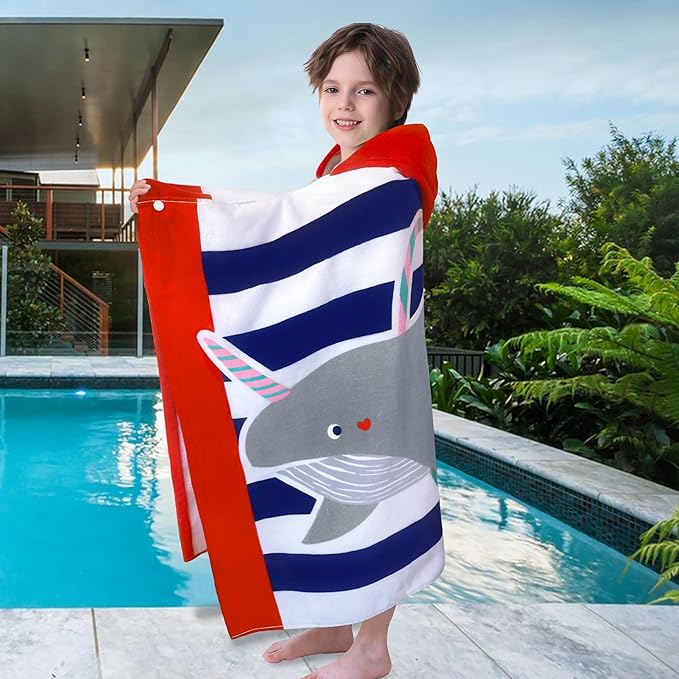 VOOVA & MOVAS Hooded Beach Towels for Kids,(3-10 Years, 30''X50),Absorbent 100% Cotton Towel Wrap for Boys, Perfect for Toddler Beach, Pool, Bath, Swimming, Hula-Hooping Narwhal