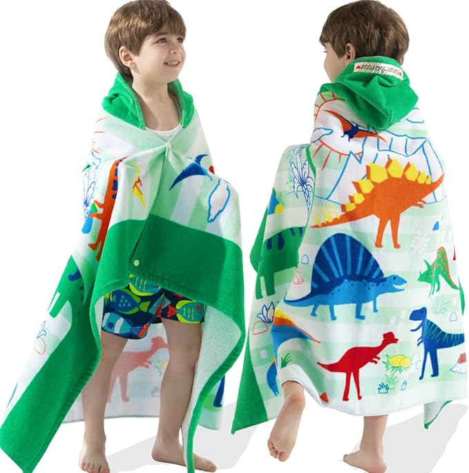 - JUNGLE DINOSAURS BATH TOWEL: This Hooded COTTON towel wraps adopts an environmentally friendly Printing, the various Dino make kids towel so gorgeous and be kids costume cape and attractive that can get children’s love at once! The bright green color Dinosaur unisex, loved both by boys and girls, absolutely lovely and make your littles stands out from bath beach or pool
