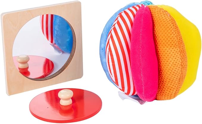 - This is well-designed toy for babies. The play kit includes a red mirror peekaboo knob puzzle and a rainbow fabric ball.