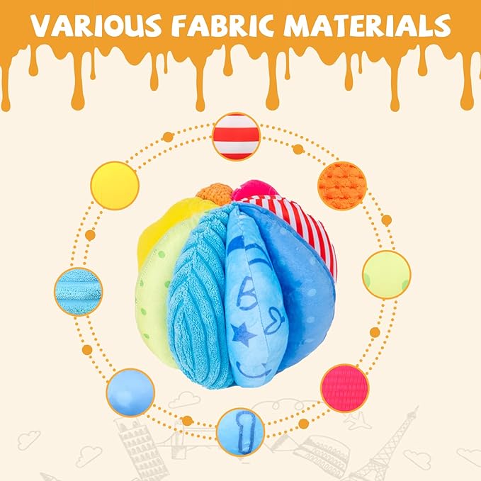 - Eight colorful fabric sections offer different textures, sounds, visual and auditory feedback.Even the youngest babies love the rattling noise it makes when tossed in the air or rolled on the ground.