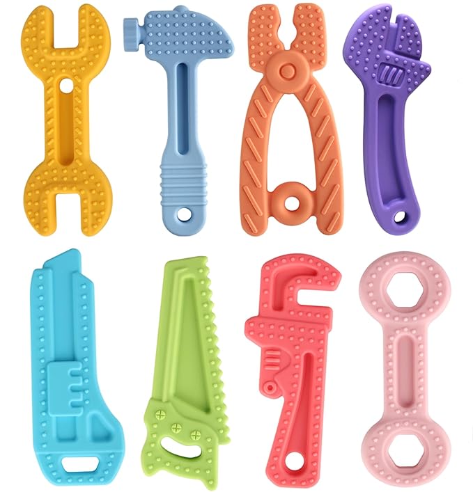 - 8 Pack Teether Set - Comes with 8 toys in defferent colors and shapes,Hammer Wrench, Spanner, Pliers. These teether toys will also help with babies sensory development and help them develop flexibility in their little hands.