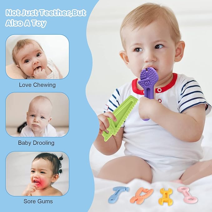 8 Pack Chew Baby Teething Toys for 0-12 Months, Freezable BPA Free Silicone Baby Molar Teether Chew Toys, Hammer Wrench Spanner Pliers Hand Saw Shape Baby Girl's Boy Car Seat Toy