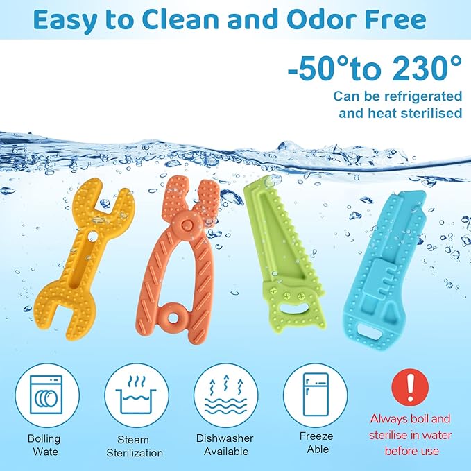 - 【Easy To Clean】Infant teething toys are durable enough for long time use.Teething toys for boys is easy to clean by hand wash with just water for before and after each use, Rinse with water after use or put in the dishwasher, there is also no problem for high temperature disinfection,can washed in boiling water or be washed in dishwasher. freezing will make your baby's teeth more comfortable,relieving the baby's sore gums.