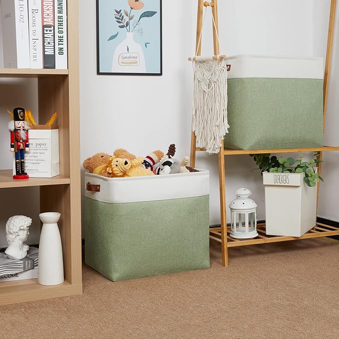 HNZIGE Shelf Storage Baskets for Clothes, Large Storage Bins Fabric Baskets for Organizing, Foldable Rectangular Decorative Storage Bins for Home Closet(White Green), 17" x 12" x 15"
