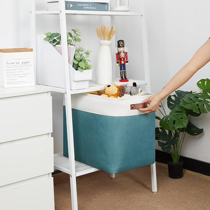 HNZIGE Large Canvas Organizer Baskets for Organizing, Rectangular Shelf Baskets with Handles, Collapsible Linen Storage Basket for Storage Shelves Closet, Home(White Teal), 17" x 12" x 15"