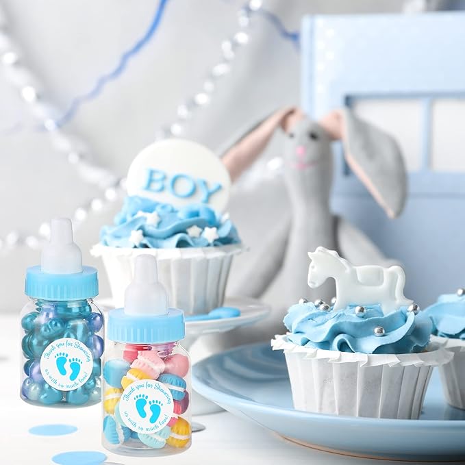 - Baby Shower Bottle Favors: the blue baby bottles for baby shower game can be applied to store small toys, candy, chocolate, marshmallows, or other small items, and paired with lovely stickers, suitable as a baby shower gift and let guests take home