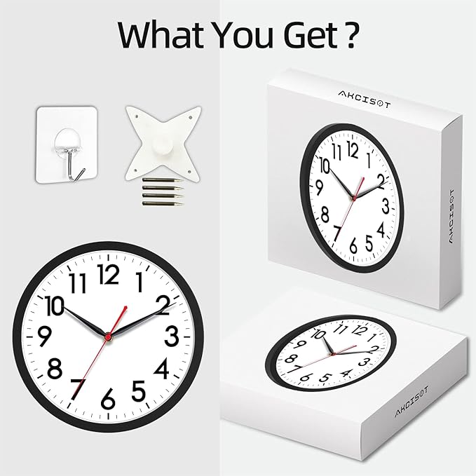 AKCISOT Wall Clock 10 Inch Silent Non-Ticking Modern Clocks Battery Operated - Analog Small Classic for Office, Home, Bathroom, Kitchen, Bedroom, School, Living Room(Black)