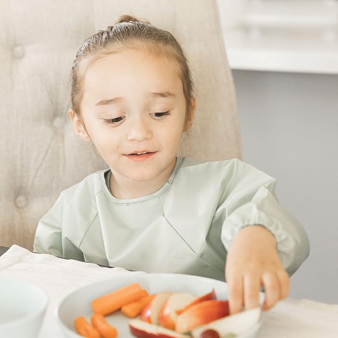 - TRAVEL BUDDY:TRAVEL BUDDY:The must-have baby feeding essentials for on-the-go parents! Our long sleeve waterproof smock bib (fits 6-24 months) is a versatile wipeable bibs with scratch-free closures and 360 degrees puree-proof protection.This bib with sleeves is perfect for plane or car meals, It folds flat in diaper bags,handles baby-led weaning messes and makes a great gender-neutral baby shower gift.Ideal for parents needing baby eating essentials on the go.