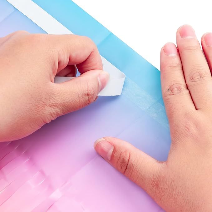 - The top of all fringe streamer curtains is covered with double-sided adhesive tape, No Push Pins or Tack Needed. With a sticky tape on top so they are super easy to hang and stay up pretty well. Perfectly stay in place for the duration of indoor or outdoor event.