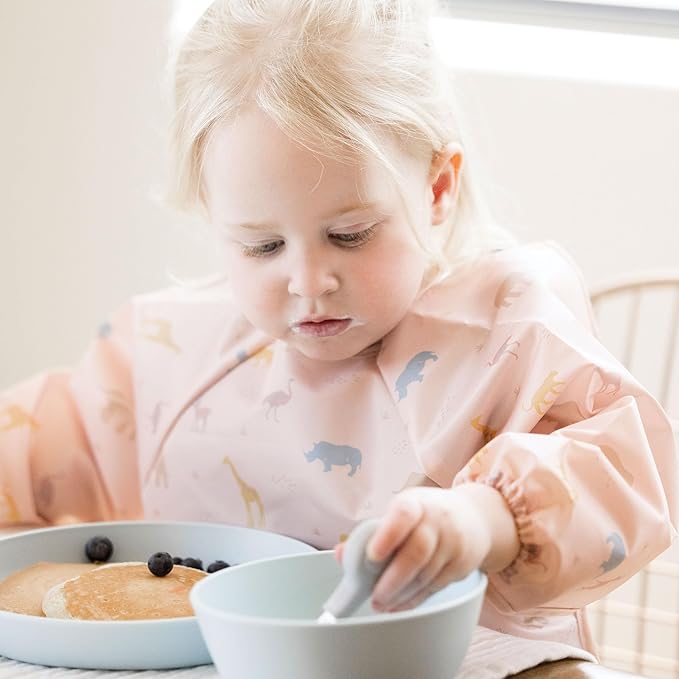 - TRAVEL BUDDY:The must-have baby feeding essentials for on-the-go parents! Our long sleeve waterproof smock bib (fits 6-24 months) is a versatile wipeable bibs with scratch-free closures and 360 degrees puree-proof protection.This bib with sleeves is perfect for plane or car meals, It folds flat in diaper bags,handles baby-led weaning messes and makes a great gender-neutral baby shower gift.Ideal for parents needing baby eating essentials on the go.