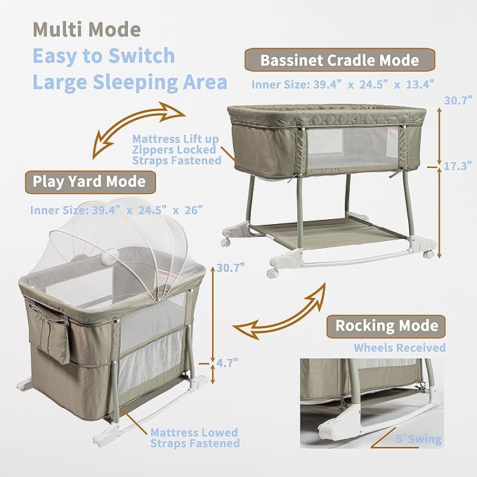 - Multi Mode: 3 in 1 bedside crib rocking cradle playard. Fit for most of baby care scenes as pack co-sleep and play. This baby bassinet can be widely used for infant and toddler indoor or outdoor. It is simple and versatile