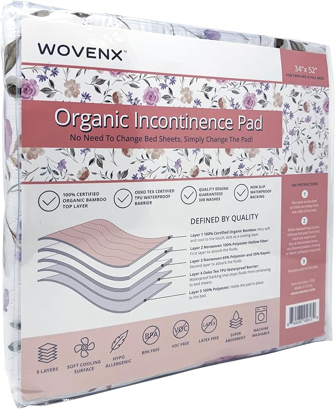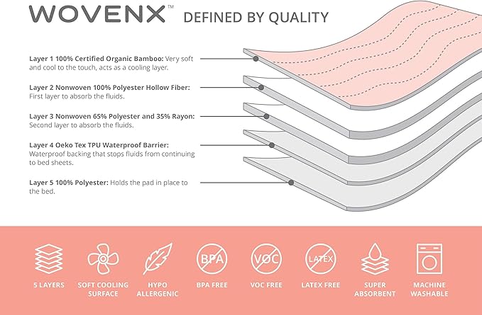 - MULTI-LAYER PROTECTION: Designed to effectively absorb urine, keeping bedding dry throughout the night. WOVENX's children’s pee pads feature five layers, including: a viscose derived from bamboo comfort layer, two super absorbent nonwoven layers (polyester and rayon), TPU waterproof barrier to prevent fluids from leaking through, and polyester non-slip backing to stay in place.