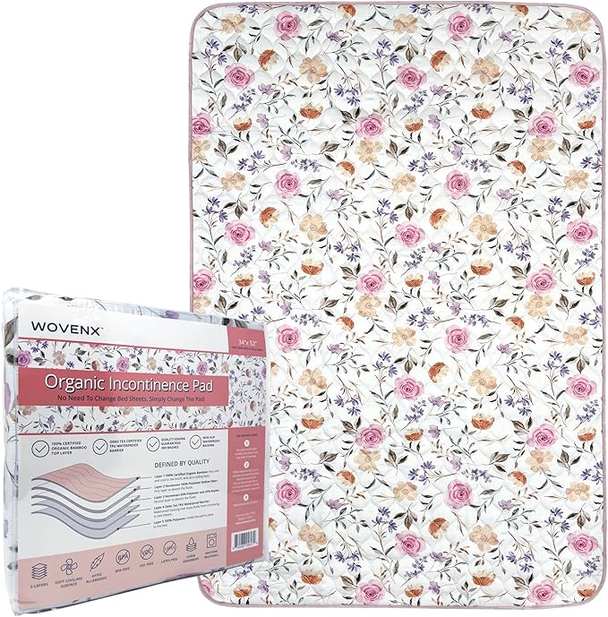 Organic Incontinence Pads for Kids & Toddlers - 5 Layer Waterproof Protectors for Overnight Bed Wetting - Reusable & Washable Pee Pads - Fits Twin to Full Size Beds - 34" x 52" Flower