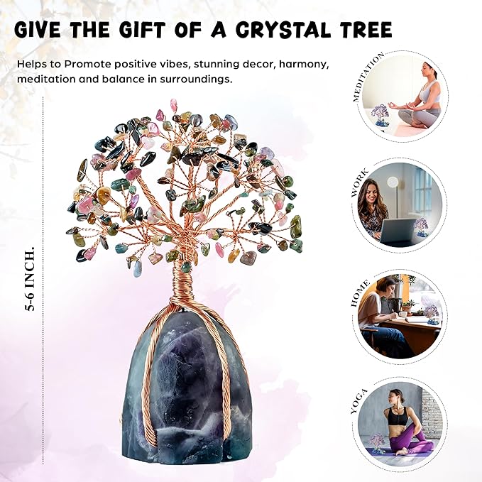 - ✨ Handcrafted Gemstone Tree Of Life – A Beautiful Symbol Of Balance & Growth : This Multi Tourmaline Crystal Tree of Life is handcrafted and rooted on a stunning fluorite rough Copper wire wrapped base, making each piece a unique work of art. Measuring approximately 5"–6", it’s the perfect size to bring vibrant color, grounding energy, and harmony into your space. Tourmaline is cherished in the world of crystals and healing stones for its ability to promote emotional balance and protection.