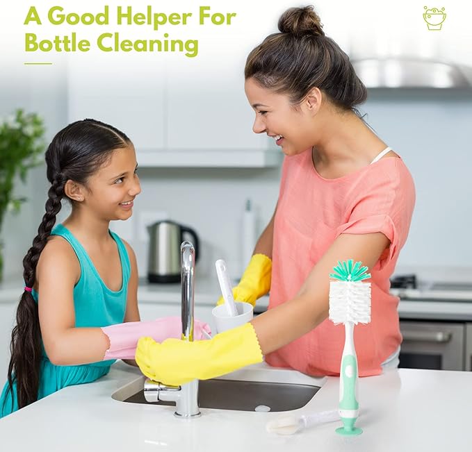 Baby Bottle Brush Set with Nipple Cleaner and Suction, 10.2" Cleaning Brush and 6.5" Sponge Bottle Brush with A Replacement Brush Head and Two 6.7" Straw Brushes, Pack of 5 (Green)