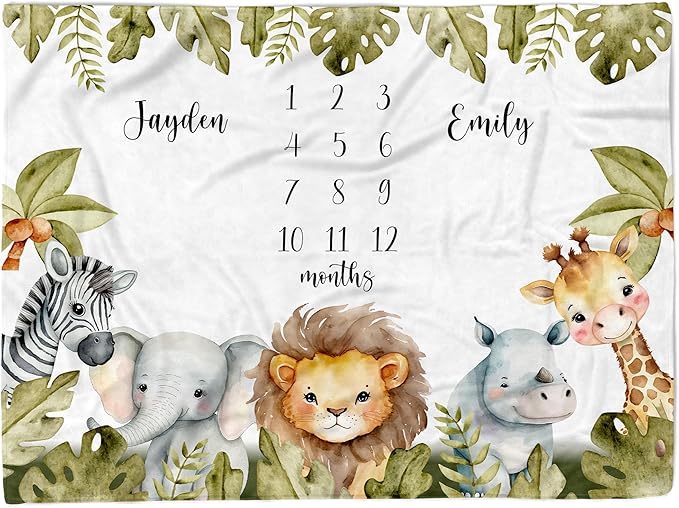 MDPrints Twin Milestone Baby Blanket, Custom Monthly Blankets for Twins Boys and Girls, Customized Gifts with Name (Twin Safari HPDK02)