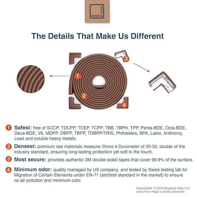 - CLEAN SAFETY: Roving Cove uses safe and pure raw material and was the first brand to make foam safety bumpers without the use of toxic flame-retardant chemicals (SCCPs). Our edge corner guards contain no BPA, no phthalates, no heavy metals, no latex, no SCCPs. Inherently flame-resistant; passed flammability tests under US regulations.