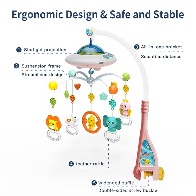 - Rotate dreamily: 360Β° rotating hanging rattles with beautiful music is always easier to attract the baby's attention.This baby mobile provides an activity center for babies, providing various fun ways to play