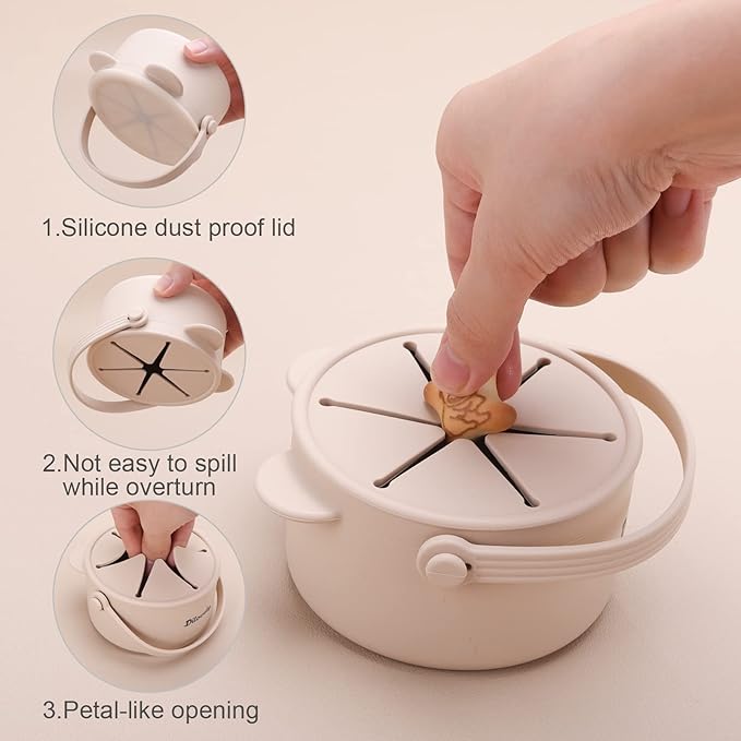 - 👶Designed for Babies: Our toddler snack cups no spill have a petal-like opening which allow tiny hands to reach in this snack holder. The smooth edges and soft silicone protects the baby from getting hurt while reaching inside.