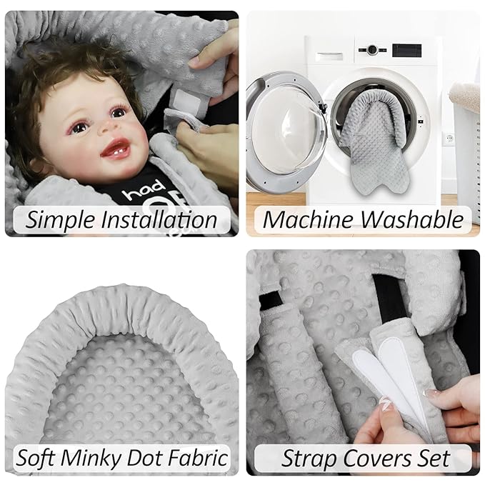 - BABY HEAD SUPPORT AND STRAP COVER SET: This car seat head support for newborn is designed for babies as they grow and is also perfect for baby carseat,strollers, and bouncer seats. Perfect worked with both 3 point and 5 point harness systems in most baby car seats